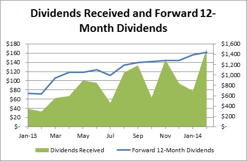 Not only are the February, May, August, and November months my highest cycle in general (at this point), but were especially high this month due to ARCP. In February, ARCP distributed a special dividend to investors as part of their finalizing the Cole acquisition. While this was already a rockstar month with dividends received, five of my holdings saw announced dividend increases. These five holdings were Cisco (CSCO), Digital Realty Trust (DLR), Coca-Cola (KO), Lorillard (LO), and TAL International (TAL). So far, eight of my fifteen positions have increased their dividends.