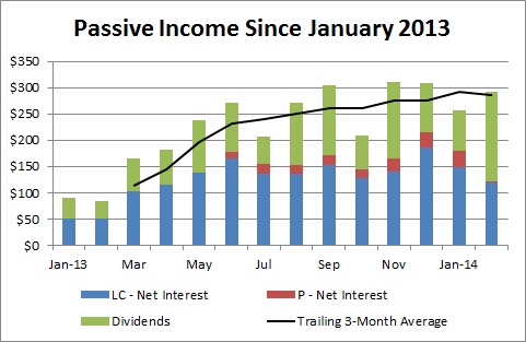I like to examine the cyclical nature of my passive income due to timing. Smoothing out the trends of income is important to me, so finding a good means of doing this was something I worked on before deciding to do a three-month moving average. This will allow me to see my growing passive income stream while helping to erase the swings in timing from dividends and the somewhat choppy nature of peer to peer lending. Of course, this won’t insulate me completely from swings, but should smooth things out nicely!
