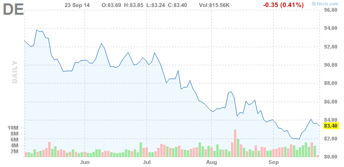 Fairly valued at just approximately 9.5 times trailing 12-month earnings, DE has seen some weakness in its stock price over the last six months, as seen below: